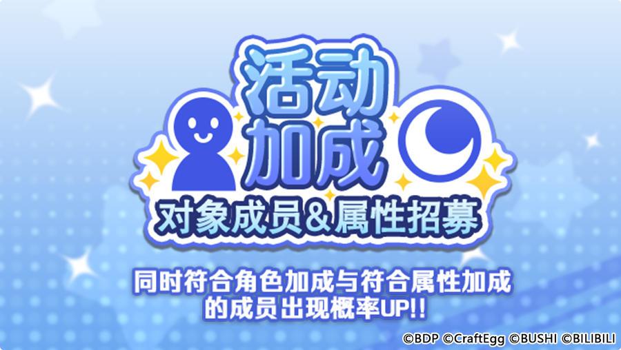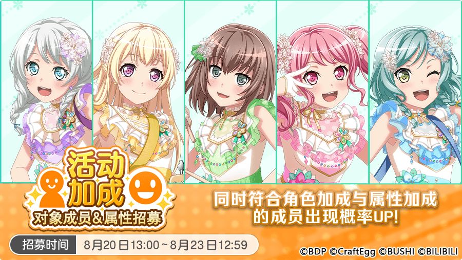 各位亲爱的BanG Dreamer: 8月20日,游戏内将开启「活动加成对象成员&属性招募」,仅会出现符合角色加成的成员与符合属性加成的成员!同时符合以上两种加成的成员出现概率UP! 且本招募每进行招募一次,即可获得一枚「灯火通明 繁华的长夜招募贴纸」! ★招募日程★ 招募时间:8月20日13:00~8月23日12:59 ★招募说明★ ※每从「活动加成对象成员&属性招募」中获得1名成员,即可对应地