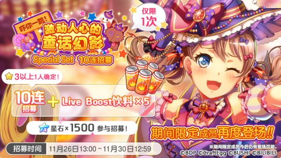 各位亲爱的BanG Dreamer: 11月26日,游戏内将开启「吓你一跳!激动人心的童话幻影 ·Special Set 10连招募」! 原需消费2500星石进行的10连招募,在本招募中仅需使用1500付费星石即可进行~此外,本招募还必得一位3★或以上成员,并附赠Live Boost饮料×5! ★招募日程★ 招募时间:11月26日13:00~11月30日12:59 ★Set内容★ ①一次10连招募