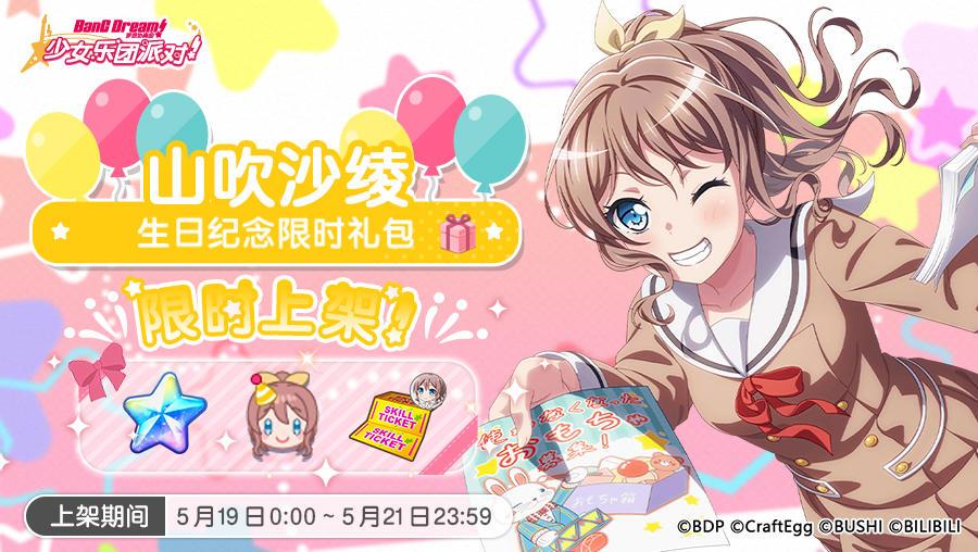 各位亲爱的BanG Dreamer: 为庆祝沙绫的生日,游戏内现已上架「沙绫生日纪念限时礼包」! 礼包内含付费星石、沙绫生日纪念装饰及沙绫专用技能练习券;生日纪念装饰为简中版原创定制,希望大家能够喜欢 (=>ω •=)‥♡ ★上架期间★ 5月19日0:00~5月21日23:59 ★礼包内容★ 「沙绫生日纪念限时礼包」:售价25元,购买后即可获得[付费星石×500]+[沙绫专用技能练习券×1]+[沙