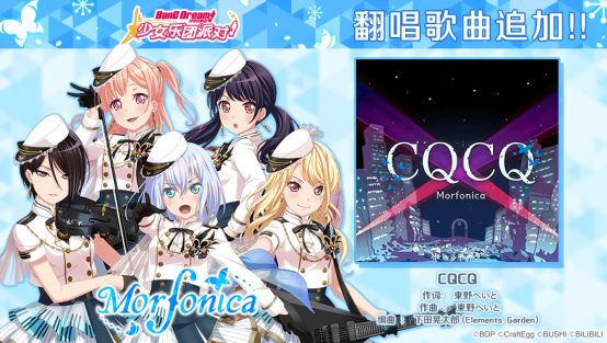 10月12日,游戏内翻唱歌曲追加! ★歌曲追加★ 曲名:CQCQ 乐队:Morfonica 主唱:仓田真白(CV:进藤天音) ※追加的翻唱歌曲将于今日维护后上架CiRCLE乐曲商店,您可以使用音色水晶交换获得~
