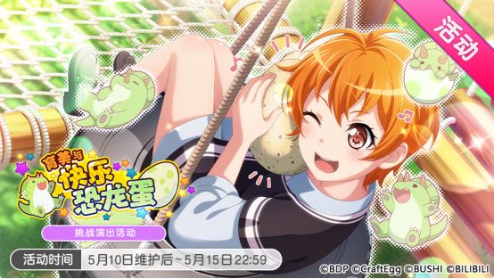 各位亲爱的BanG Dreamer: 5月10日维护后,游戏内将开启「育美与快乐恐龙蛋」挑战演出活动和「SUN×2 遥远的太古 招募」以及「SUN×2 遥远的太古 限定1次超值招募」;活动新曲《ないすみちゅっ!》可以在挑战演出模式下进行演奏;活动挑战歌曲《新宝島》及《ハイファイブ∞あどべんちゃっ》将解锁拥有全新谱面的「SPECIAL」难度! 一、「育美与快乐恐龙蛋」挑战演出活动开启! ★活动日程★