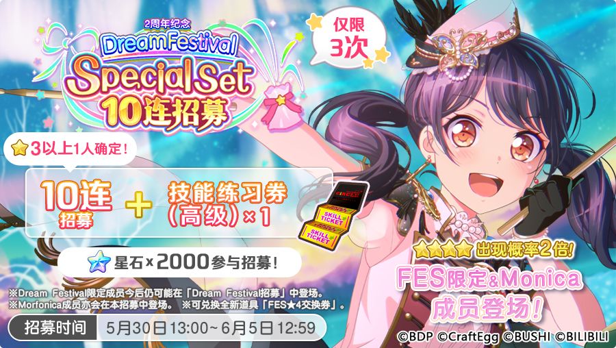 各位亲爱的BanG Dreamer: 5月30日,游戏内将开启「2周年纪念 Dream Festival Special Set 10连招募」! 原需消费2500星石进行的十连招募,在本招募中使用2000付费星石即可进行~此外,本招募还必得一位3★或以上成员,并附赠「技能练习券(高级)×1」~ 与「2周年纪念Dream Festival招募」相同,FES限定成员及Morfonica乐队成员将在本招