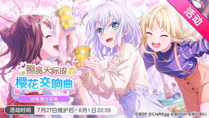 各位亲爱的BanG Dreamer: 7月27日维护后,Morfonica乐队首次活动正式上线!游戏内将同步开启「照亮天际的樱花交响曲」试炼演出活动和「流光溢彩的精灵花园招募」「★3以上Morfonica成员确定 1回免费招募」,更新「★★★以上确定招募」,并追加原创活动歌曲《ブルームブルーム》,还将特别追加首次活动开启纪念·翻唱歌曲《アゲハ蝶》! 此外,游戏内还将开启「Morfonica首次活动
