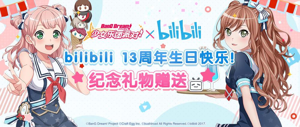bilibili 13周岁生日快乐! CiRCLE哔哩店为大家准备了一份生日贺礼,现已发放至大家的邮箱,还请登录游戏及时领取~ ★礼物内容★ 星石×1300+小型Live Boost饮料×13+奇迹水晶×13 ★领取期限★ 6月26日11:00~7月3日10:59 BanG Dream! 少女乐团派对! × bilibili纪念联动活动进行中! 「联动纪念·登录奖励活动」将于今日13:00开启,同