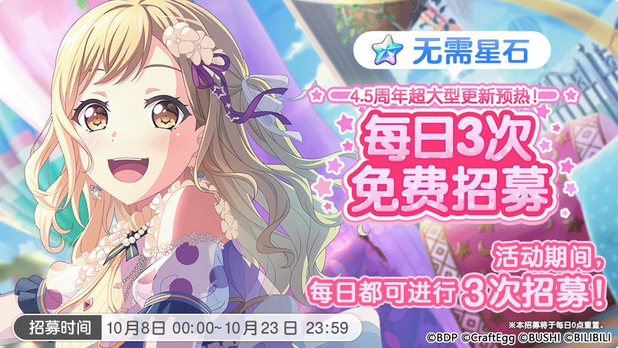 各位亲爱的BanG Dreamer: 10月8日0:00,游戏内将开启连续16天·每日次数更新的免费招募——「4.5周年纪念预热!每日3次免费招募」!活动期间,累计可进行48次免费招募,还请不要错过~ ★活动时间★ 10月8日0:00~10月23日23:59 ※每日0:00~23:59期间限参加1次。 ★招募说明★ 2.不会出现往期登场过的期间限定成员及联动限定成员。 3.本招募在活动