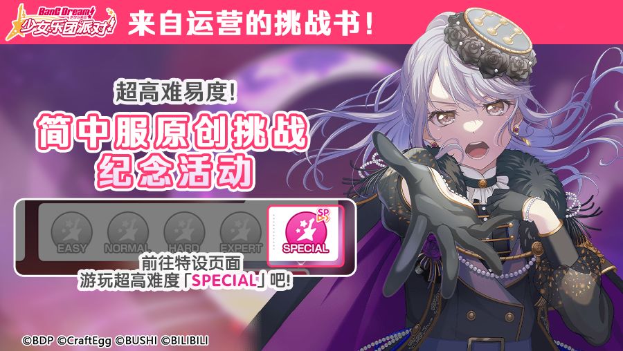 各位亲爱的BanG Dreamer: 至今为止最高难度的「超高难度 新SPECIAL难度 」即将来袭!11月8日更新维护后,游戏内将以期间限定歌曲的方式同步开放「六兆年と一夜物語」「HELL! or HELL?」的超高难度!大家来挑战超高难的谱面吧——— 以上是原定开展的内容,但是为了能让大家更有勇气挑战,也为了给挑战成功的玩家颁发荣誉!我们还将开启简中原创的特别挑战活动! 活动期间内,达