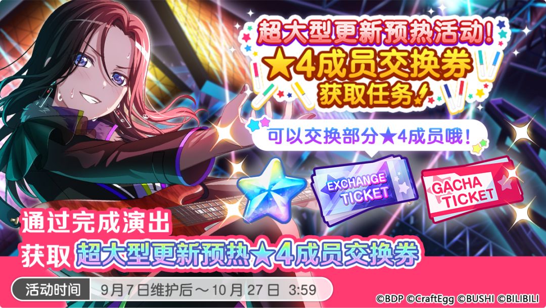 各位亲爱的BanG Dreamer: 9月7日维护后,游戏内将开启「超大型更新预热活动!★4成员交换券获取任务!」,活动期间,完成所有每日开启的「每日任务」以及活动期间开启的「期间限定任务」,即可获得「超大型更新预热!★4成员交换券」、「星石×1000」、「星石招募券」等丰厚奖励! ★活动时间★ 9月7日维护后 ~10月27日 3:59 【「超大型更新预热 ★4交换券」注意事项】 ※「