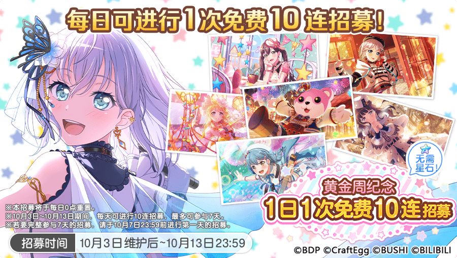 各位亲爱的BanG Dreamer: 10月3日维护后,游戏内将开启每日次数更新的免费10连招募——「黄金周纪念 1日1次免费10连招募」!活动期间,每天可参与1次免费10连招募,最多可参与7日,累计可进行70连免费招募,还请不要错过~ ★活动时间★ 10月3日维护后~10月13日23:59 ※每日0:00~23:59期间限参加1次。 ★招募说明★ 1.本招募为免费进行的10连招募,每日免费招募时