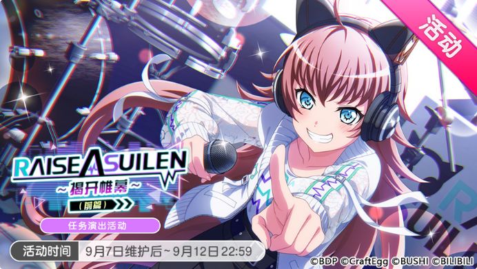 各位亲爱的BanG Dreamer: 新乐队RAISE A SUILEN (简称RAS)将于今日维护后正式登场!围绕新乐队,游戏内不仅将追加新乐队相关资源、开放新区域场景【CHU²的公寓】及区域道具,还将同步开启任务演出活动「RAISE A SUILEN~揭开帷幕~(前篇)」、可招募RAS新成员的「参战!Change the World招募」、免费参与5次的「RAISE A SUILEN 登场纪念