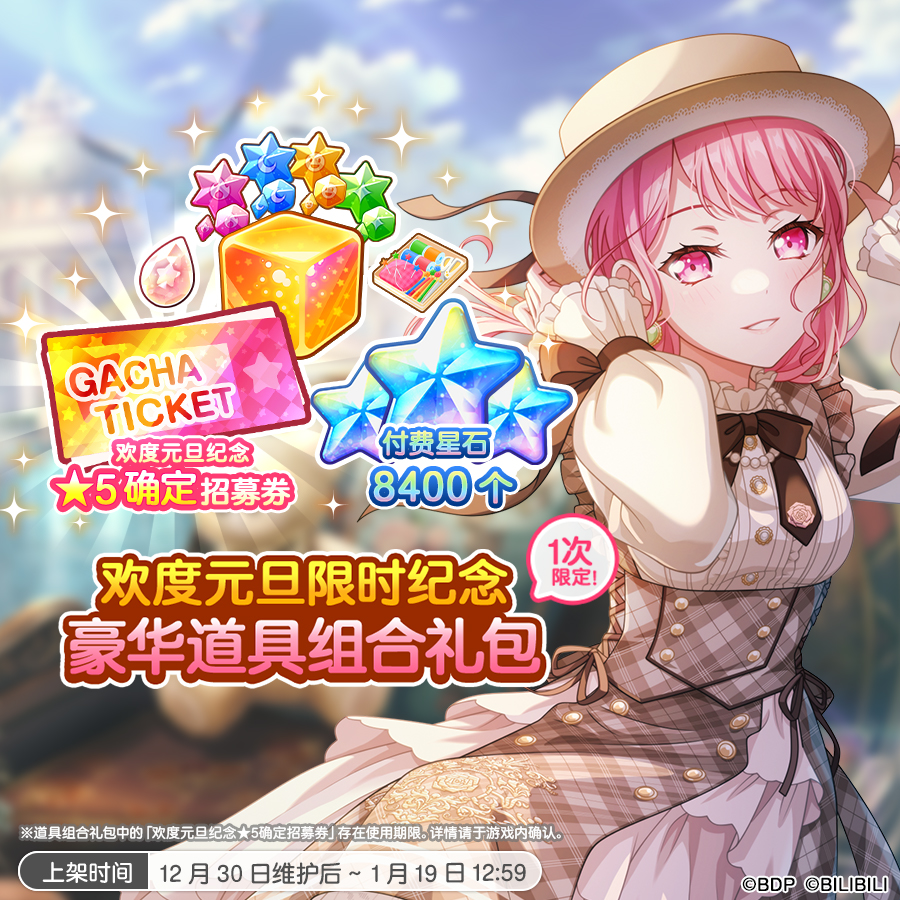 各位亲爱的BanG Dreamer: 为了庆祝2026元旦佳节的到来,游戏内将于12月30日维护后,上架豪华礼包「欢度元旦限时纪念豪华道具礼包」和「欢度元旦限时纪念高级道具礼包」,购买对应礼包可分别获得★5确定招募券×1、★4以上确定招募券×1、大量付费星石与养成道具,超值礼包不要错过呀。 ★各礼包上架期间★12月30日维护后~1月19日12:59 一、「欢度元旦限时纪念豪华道具礼包