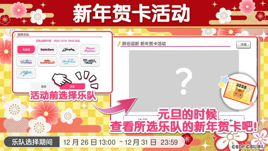 各位亲爱的BanG Dreamer: 新年将至,12月26日13点起,游戏内将开启新年贺卡预选,大家可以选择自己心仪的乐队,在2026年元旦到来之际就可以查看相应乐队的贺卡,请千万不要错过~★新年贺卡活动★●活动日程【乐队选择期间】2025年12月26日13:00~2025年12月31日23:59【新年贺卡阅览期间】2026年1月1日0:00~1月10日12:59 ●活动参与规
