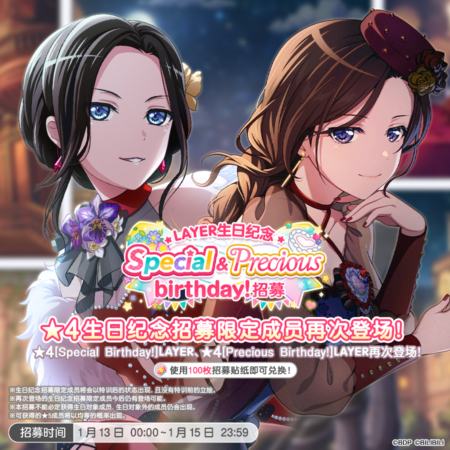 明天(1月13日)就是LAYER生日了~明日起,游戏内将限时开放「LAYER生日纪念 Special&Precious birthday!招募」!过往登场过的生日纪念限定成员「★4LAYER[Special birthday!]、★4LAYER[Precious birthday!]」在本招募中再次登场!※在本招募中出现的包括生日纪念限定成员在内的所有★2、★3、★4LAYER成员都将会比同稀
