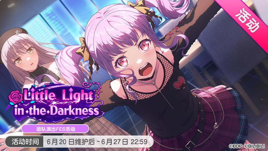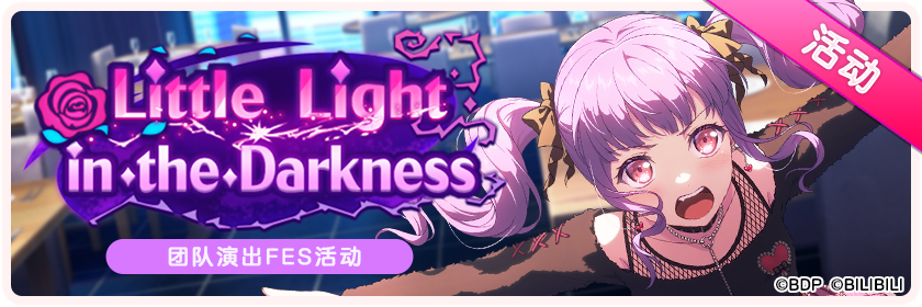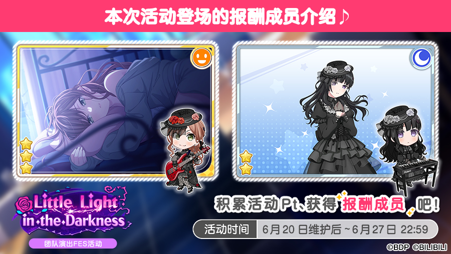 各位亲爱的BanG Dreamer: 6月20日维护后,游戏内将开启「Little Light in the Darkness」团队演出FES活动、「佇立于暗夜中的寂静蔷薇招募」和「★2・★3・★4角色加成对象成员确认招募」,并追加原创歌曲《覚悟のLiberation》!此外,还将更新「★★★以上确定招募」。欢迎登录游戏查看~ 活动一、「Little Light in the Darkne