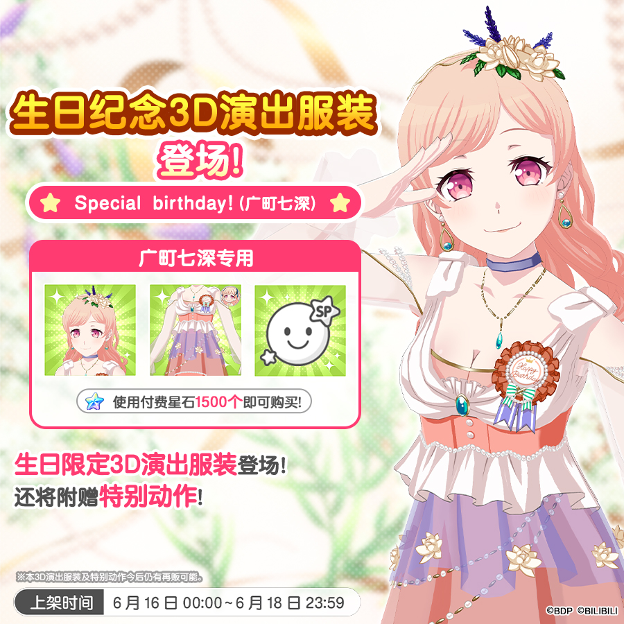 各位亲爱的BanG Dreamer: 游戏内现已在星石商店上架「七深生日纪念3D演出服装」!您可以前往星石商店进行选购~★贩售时间★6月16日0:00~6月18日23:59 ★贩售价格★付费星石×1500 ★3D演出服装内容★3D演出服装「Special Birthday(广町七深)」・Special birthday!(广町七深)「服装+发型・饰品」・动作「大小姐翩翩