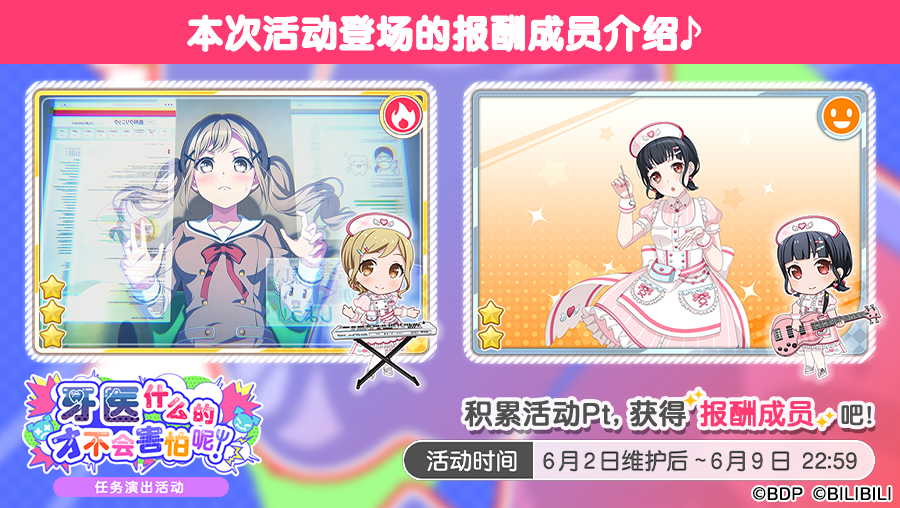 积累活动Pt即可获得附赠演出服装的全新活动报酬成员——★3 市谷有咲[搜索开始]、★2 牛込里美[牙科镜]!本期活动将于6月9日22:59结束,快来参与活动吧~ 今后也请多多支持《BanG Dream! 少女乐团派对!》!