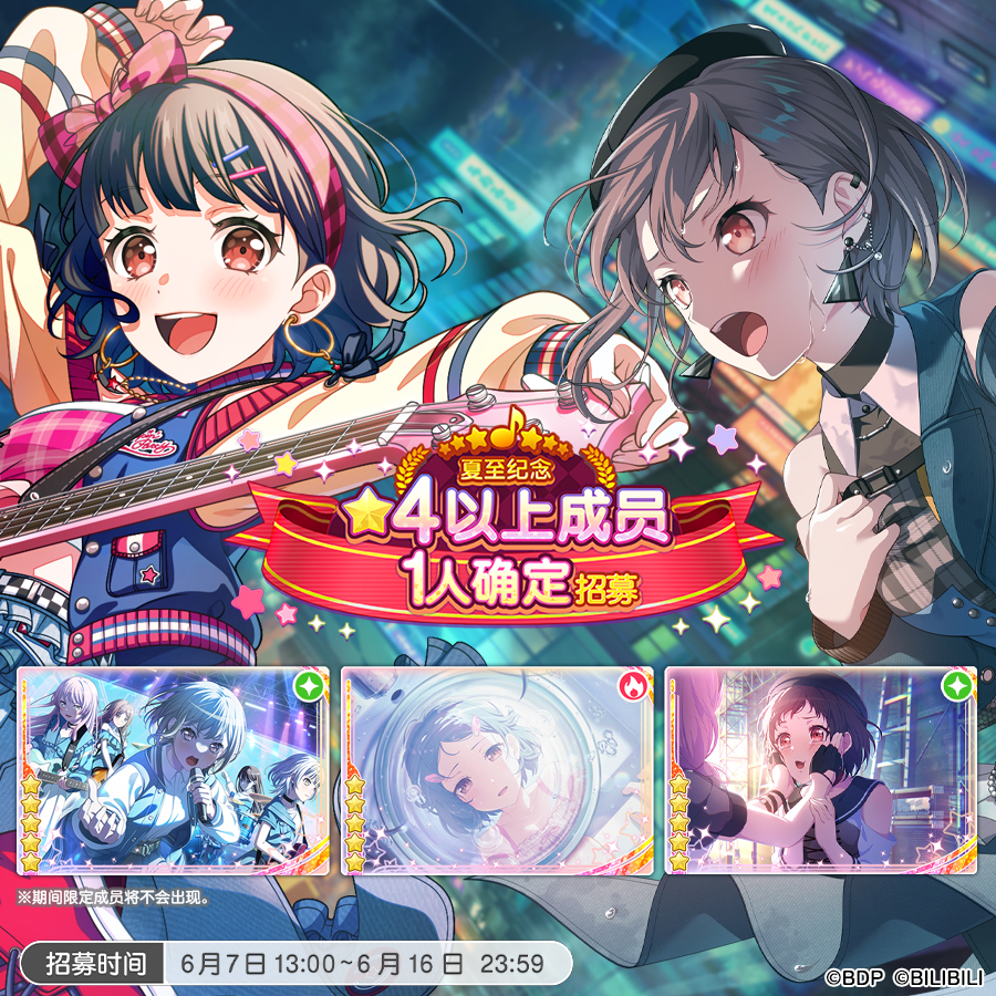 各位亲爱的BanG Dreamer: 夏日将至,游戏内将开启「夏至纪念★4以上成员1人确定招募」!活动期间仅限使用2500付费星石进行一次十连招募,且必得一位的★4及以上成员!★招募日程★6月7日13:00~6月16日23:59 ★招募内容★·10连招募(必得一位的★4及以上成员)※仅出现截至2024年4月19日之前登场过的成员。 ★招募说明★※「夏至纪念★4以上成员1人确定