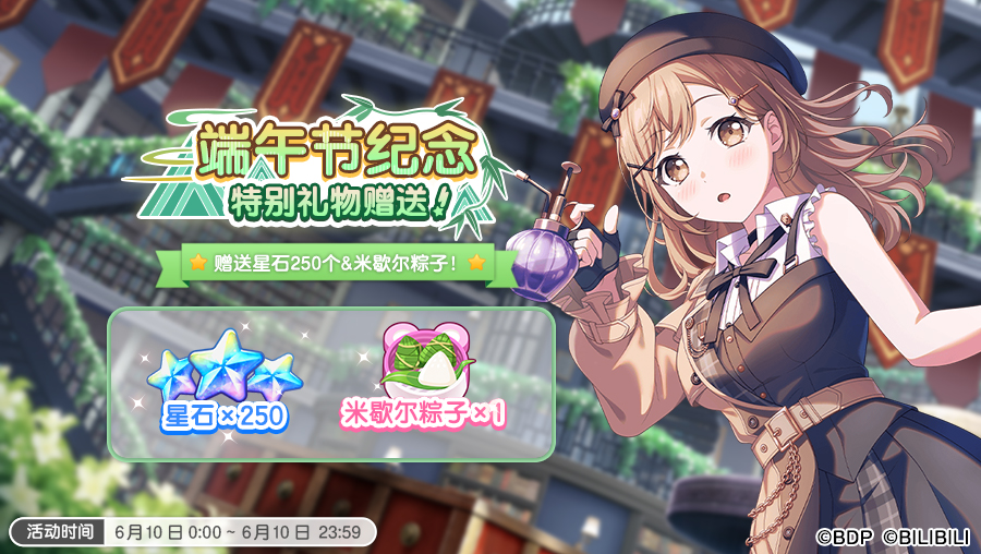 各位亲爱的BanG Dreamer: 初夏树影摇曳,端午粽意浓浓,今天是端午节!CiRCLE哔哩店奉上今年的端午节礼物——原创道具「米歇尔粽子」+「星石×250」,还请记得登录游戏获取哦~米歇尔粽子会是什么馅的呢?祝大家端午安康!ദ്ദി˶ー̀֊ー́ )✧★领取时间★6月10日0:00~6月10日23:59 ★礼物内容★星石×250米歇尔粽子×1 今后也请多多支持《Ban