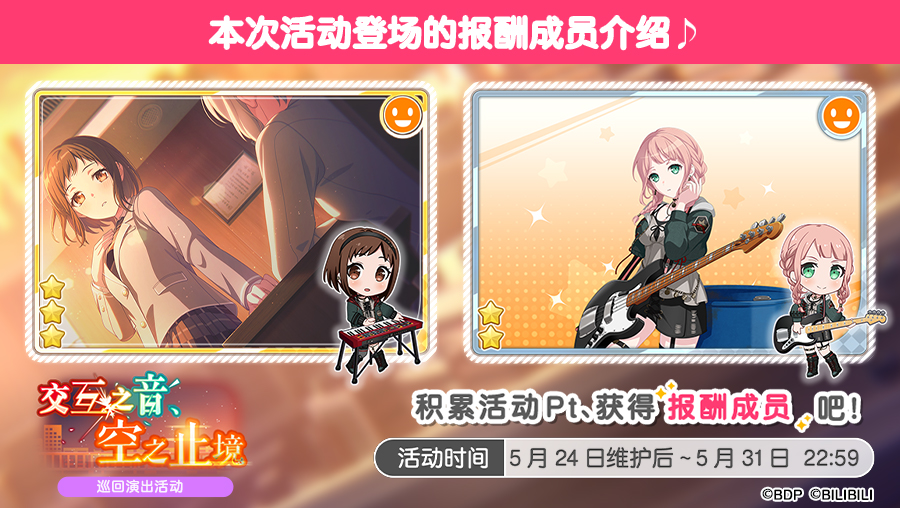 积累活动Pt即可获得附赠衣装的全新活动报酬成员——★3 羽泽鸫[二人的想法]、★2 上原绯玛丽[摇曳着不安的眼眸]!本期活动将于5月31日22:59结束,快来参与活动吧~ 今后也请多多支持《BanG Dream! 少女乐团派对!》!