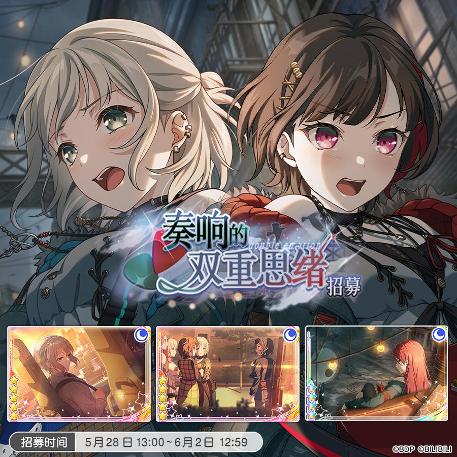 各位亲爱的BanG Dreamer: 5月28日,游戏内将开启「奏响的双重思绪招募」,5月24日维护后新登场的招募成员将在本招募登场,且相比同稀有度其他成员出现概率提升!★招募日程★招募时间:5月28日13:00~6月2日12:59 ★招募简介★「奏响的双重思绪招募」新登场成员:★5 青叶摩卡[夕阳照耀下的侧脸]★5 美竹兰[坦率传达的话语]★4 宇田川巴[来自天台的消息]本