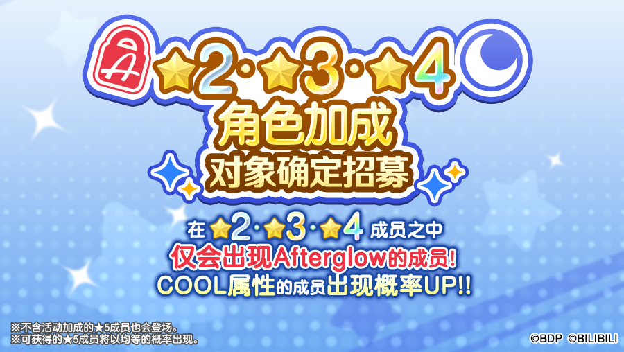 各位亲爱的BanG Dreamer: 5月28日,游戏内将开启「★2・★3・★4角色加成对象成员确认招募」,游戏内将开启「★2・★3・★4角色加成对象确认招募」,仅会出现符合角色加成的成员与符合属性加成的★2・★3・★4成员!同时符合以上两种加成的成员出现概率UP!招募范围内出现的★5成员出现概率不变。且本招募每进行招募一次,即可获得一枚「奏响的双重思绪招募贴纸」!★招募日程★招募
