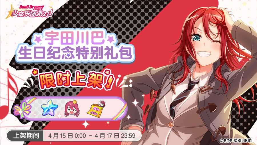 各位亲爱的BanG Dreamer: 为庆祝巴的生日,游戏内现已上架全新生日礼包——「巴生日纪念特别礼包」! 礼包分别含付费星石、巴生日纪念特别名片装饰及巴专用技能练习券。本轮次登场的各位成员的生日纪念特别装饰都将拥有自己独一无二的表情哦!喜欢的话还请不要错过~(=`ェ´=;)ゞ※本次生日纪念特别名片装饰为全新简中版原创定制,由衷地希望大家能够喜欢