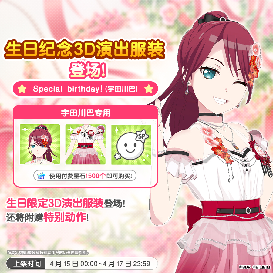 各位亲爱的BanG Dreamer: 游戏内现已在星石商店上架「巴生日纪念3D演出服装」!您可以前往星石商店进行选购~★贩售时间★4月15日0:00~4月17日23:59 ★贩售价格★付费星石×1500 ★3D演出服装内容★3D演出服装「Special Birthday(宇田川巴)」・Special birthday!(巴)「服装+发型・饰品」・动作「干脆地决定吧!(巴