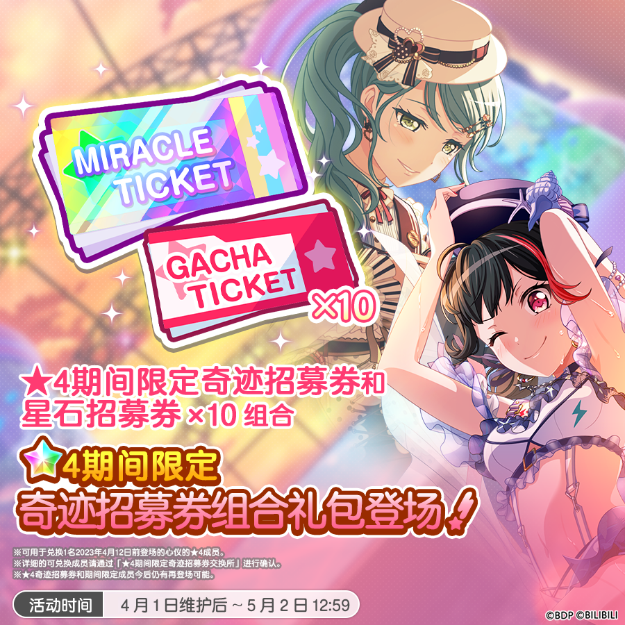 ★上架期间★4月1日维护后~5月2日12:59 ★礼包内容★·星石招募券×10★4期间限定奇迹招募券×1(可兑换1名2023年4月12日前登场的心仪的★4期间限定成员)※上架期间仅可购买1次。 ★注意事项★※「★4期间限定招募券」可在「★4期间限定招募券交换所」内兑换1名2023年4月12日前登场的心仪的★4期间限定成员。※过去登场的★4成员、Dream Festival限定成