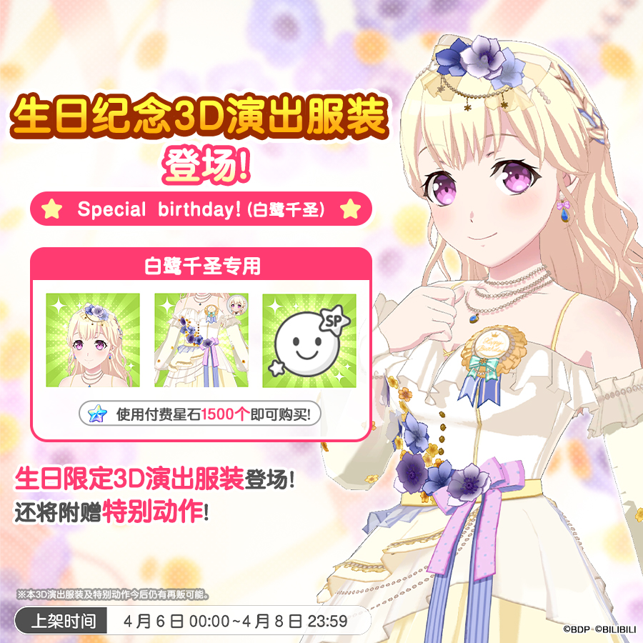 各位亲爱的BanG Dreamer: 游戏内现已在星石商店上架「千圣生日纪念3D演出服装」!您可以前往星石商店进行选购~★贩售时间★4月6日0:00~4月8日23:59 ★贩售价格★付费星石×1500 ★3D演出服装内容★3D演出服装「Special Birthday(白鹭千圣)」・Special birthday!(白鹭千圣)「服装+发型・饰品」・动作「营业模式(千圣专用