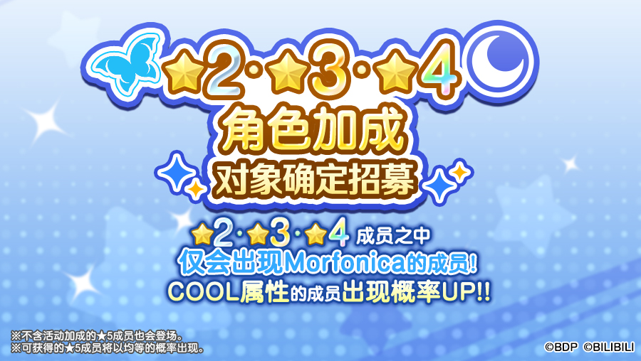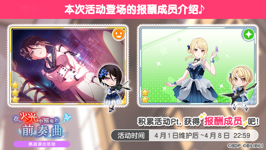 各位亲爱的BanG Dreamer: 4月5日,游戏内将开启「★2・★3・★4角色加成对象确认招募」,仅会出现符合角色加成的成员与符合属性加成的★2・★3・★4成员!同时符合以上两种加成的成员出现概率UP!招募范围内出现的★5成员出现概率不变。且本招募每进行招募一次,即可获得一枚「荧光闪烁破镜之森的蝴蝶漫舞招募贴纸」!★招募日程★招募时间:4月5日13:00~4月10日12:59