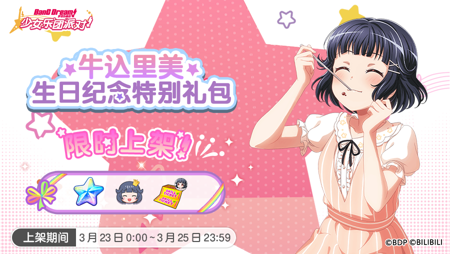 各位亲爱的BanG Dreamer: 为庆祝里美的生日,游戏内现已上架全新生日礼包——「里美生日纪念特别礼包」! 礼包分别含付费星石、里美生日纪念特别名片装饰及里美专用技能练习券。本轮次登场的各位成员的生日纪念特别装饰都将拥有自己独一无二的表情哦!喜欢的话还请不要错过~> <※本次生日纪念特别名片装饰为全新简中版原创定制,由衷地希望大家能够喜欢