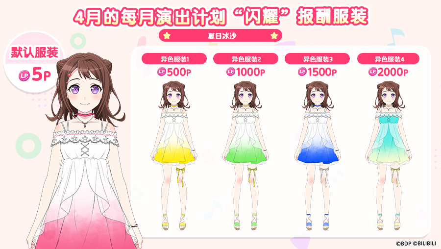 各位亲爱的BanG Dreamer:4月1日0:00起,4月【每月演出计划】即将开启,购买闪耀演出计划后即可领取对应的【闪耀】报酬,可以获得全新的3D演出服装哦!【闪耀演出计划价格】78元 【礼包内容】付费星石×1200每月演出计划「闪耀」报酬解锁 【关于每月演出计划「闪耀」报酬】1、每月演出计划「闪耀」购买「闪耀演出计划PASS」后即可解锁,收集演出点数即可获得追加报酬。