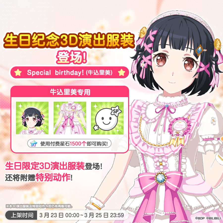各位亲爱的BanG Dreamer: 游戏内现已在星石商店上架「里美生日纪念3D演出服装」!您可以前往星石商店进行选购~★贩售时间★3月23日0:00~3月25日23:59 ★贩售价格★付费星石×1500 ★3D演出服装内容★<3D演出服装「Special Birthday(牛込里美)」>・Special birthday!(牛込里美)「服装+发型・饰品」・动作「好害羞呀…