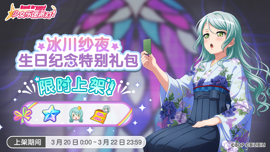 各位亲爱的BanG Dreamer: 为庆祝纱夜&日菜的生日,游戏内现已上架两款全新生日礼包——「纱夜生日纪念特别礼包」&「日菜生日纪念特别礼包」! 礼包分别含付费星石、日菜&纱夜生日纪念特别名片装饰及日菜&纱夜专用技能练习券。本轮次登场的各位成员的生日纪念特别装饰都将拥有自己独一无二的表情哦!喜欢的话还请不要错过噜♪ ※本次生日纪念特别名片装饰为全新简中版原创定制,由衷地