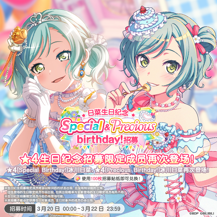 明天(3月20日)也是日菜生日~明日起,游戏内将限时开放「日菜生日纪念 Special&Precious birthday!招募」!过往登场过的生日纪念限定成员「★4冰川日菜[Special birthday!]、★4冰川日菜[Precious birthday!]」在本招募中再次登场!※在本招募中出现的包括生日纪念限定成员在内的所有★2、★3、★4冰川日菜成员都将会比同稀有度下的的其他成员出