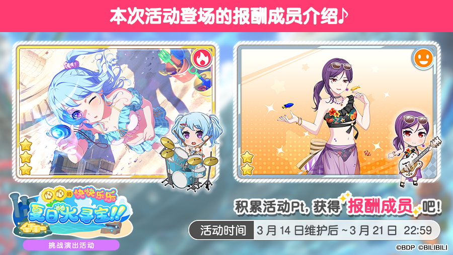 积累活动Pt即可获得附赠衣装的全新活动报酬成员——★3 松原花音[海滩上的宝石]、★2 濑田薰[与你共度的夏天]!本期活动将于3月21日22:59结束,快来参与活动吧~ 今后也请多多支持《BanG Dream! 少女乐团派对!》!