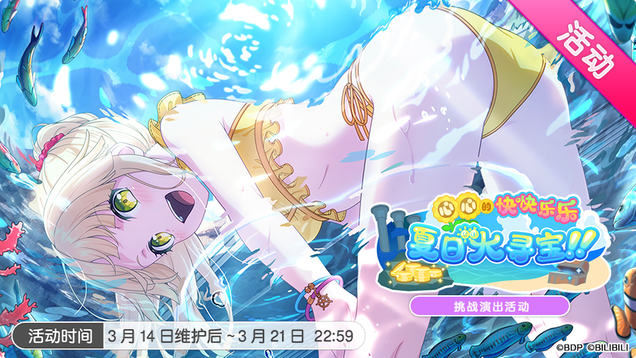 各位亲爱的BanG Dreamer: 3月14日维护后,游戏内将开启「心心的快快乐乐夏日大寻宝!!」挑战演出活动、「乘风破浪!噗通与大冒险招募」,并更新「米歇尔贴纸交换所」和「星光贴纸交换所」;共有三首活动挑战歌曲,原创歌曲《ボクらの夏's☆ショーたいむっ!!》、《ふぁいぶスマイル◯オールインっ!》以及翻唱歌曲《ダンスホール》可以在挑战模式下进行演奏,并将在活动结束后追加!此外,游戏内还将开