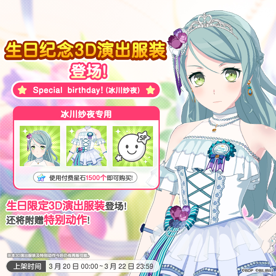 各位亲爱的BanG Dreamer: 游戏内现已在星石商店上架「纱夜&日菜生日纪念3D演出服装」!您可以前往星石商店进行选购~★贩售时间★3月20日0:00~3月22日23:59 ★贩售价格★各礼包付费星石×1500 ★3D演出服装内容★<3D演出服装「Special Birthday(冰川纱夜)」>・Special birthday!(冰川纱夜)「服装+发型・饰品」