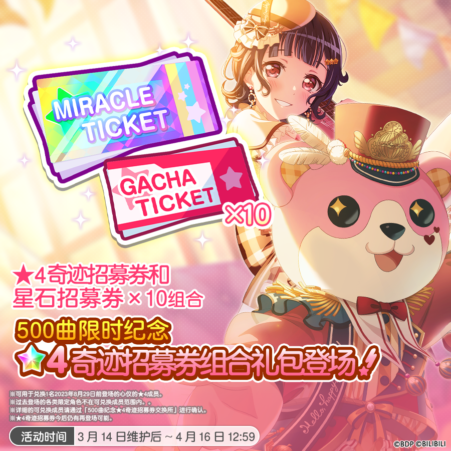 各位亲爱的BanG Dreamer: 3月14日维护后,游戏内将上架「500曲限时纪念礼包」!购买礼包可获得「星石招募券」×10以及可以兑换1名2023年8月29日前登场的心仪的★4成员的「500曲纪念★4奇迹招募券」×1。您可以前往星石商店的礼包购买界面进行购买,还请不要错过~★上架期间★3月14日维护后~4月16日12:59 ★上架价格★付费星石2500个 ★礼包内容★