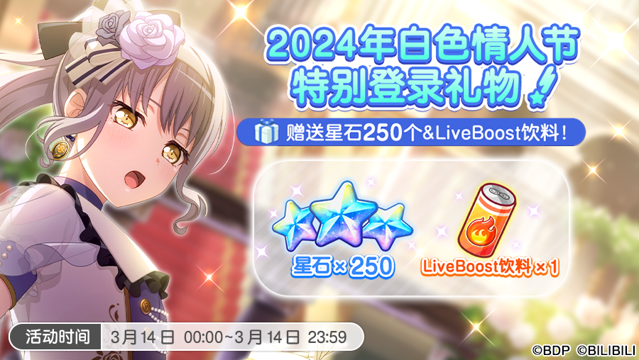 Happy White Day!今天是白色情人节,请收下这份爱的回礼吧~❤今日内登录游戏可以获得特别礼物,游戏内还将有特殊语音,大家记得登录收听!白色情人节快乐(๑╹ڡ╹)╭ ♡★活动时间★3月14日0:00~23:59 ★特别礼物★星石×250Live Boost饮料×1 今后也请多多支持《BanG Dream! 少女乐团派对!》!