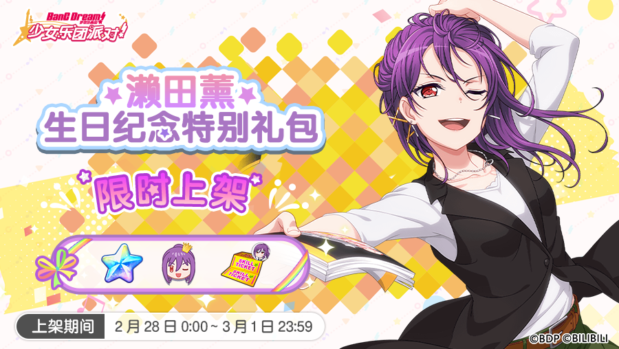 各位亲爱的BanG Dreamer: 为庆祝薰的生日,游戏内现已上架全新生日礼包——「薰生日纪念特别礼包」! 礼包内含付费星石、薰生日纪念特别名片装饰及薰专用技能练习券。本轮次登场的各位成员的生日纪念特别装饰都将拥有自己独一无二的表情哦!喜欢的话还请不要错过呀! ※本次生日纪念特别名片装饰为全新简中版原创定制,由衷地希望大家能够喜欢(っ´ω`)ノ