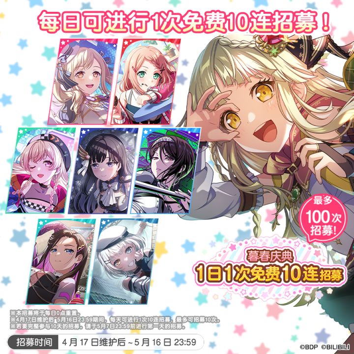 各位亲爱的BanG Dreamer: 为庆祝暮春庆典活动的开启,4月17日维护后,游戏内将开启每日次数更新的免费10连招募——「暮春庆典1日1次免费10连招募」!活动期间,每天可参与1次免费10连招募,最多可参与10日,累计可进行100连免费招募,还请不要错过~★活动时间★4月17日维护后~5月16日12:59※每日0:00~23:59期间限参加1次。 ★招募说明★1.本招募为