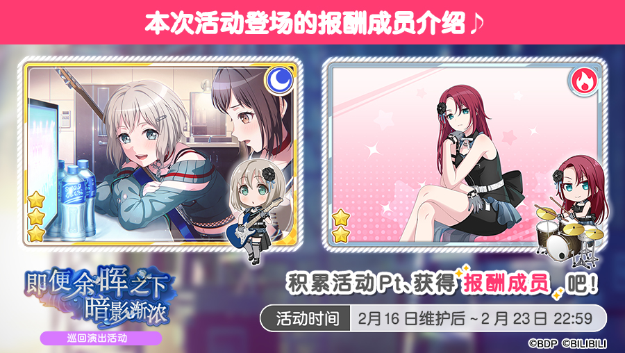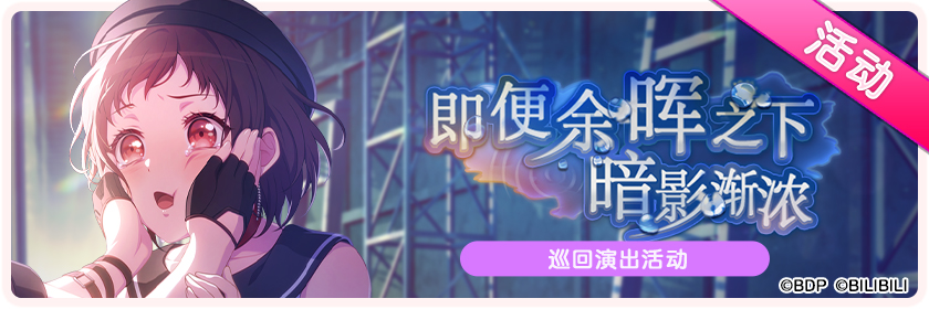 各位亲爱的BanG Dreamer: 2月16日维护后,游戏内将开启「即便余晖之下 暗影渐浓」巡回演出活动、「落泪的Pouring Rain招募」和「★2・★3・★4角色加成对象成员确认招募」,追加原创歌曲《ペトリコール・オベーション》,并开启进阶闪耀舞台-Morfonica ZEPP TOUR 2023「forte」@Zepp Osaka Bayside!欢迎登录游戏查看~ 活动一、「即
