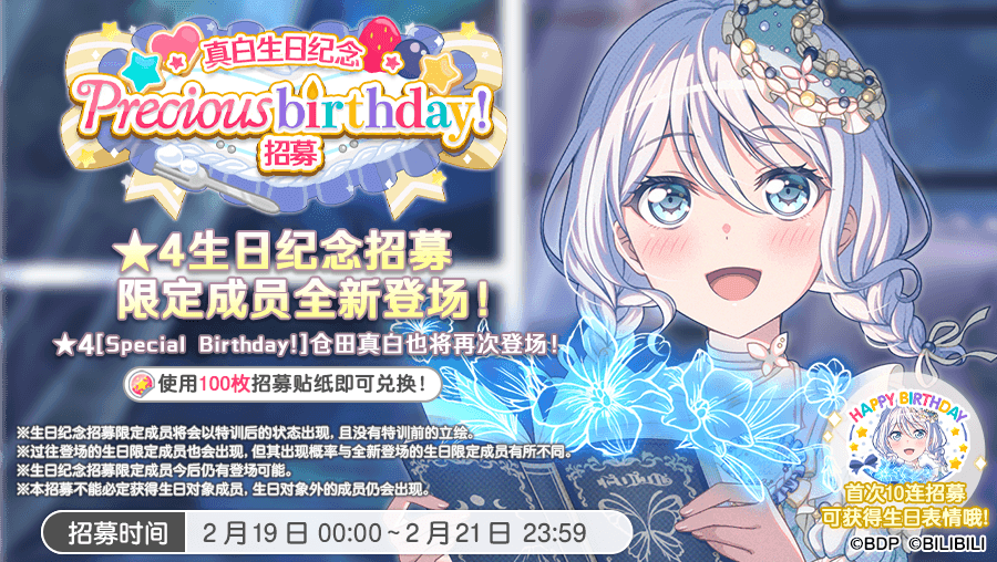 明天(2月19日)就是真白生日了~明日起,游戏内将限时开放「真白生日纪念Precious birthday!招募」!首次参与10连招募即可获得生日纪念限定表情,还请不要错过哦!此外,「★4仓田真白[Special birthday!]」也将在本次在招募中再次登场。※在本招募中出现的包括「★4仓田真白[Precious birthday!]」在内的所有★2、★3、★4仓田真白成员都将会比同稀有