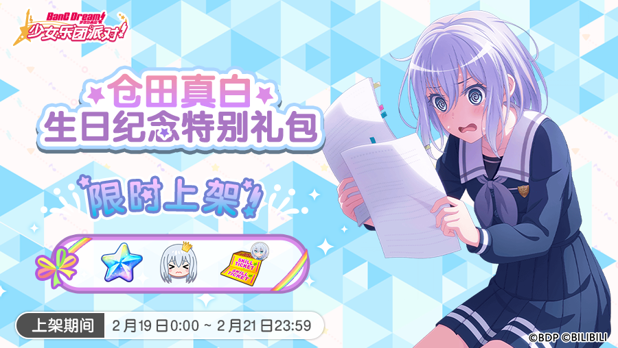 各位亲爱的BanG Dreamer: 为庆祝真白的生日,游戏内现已上架全新生日礼包——「真白生日纪念特别礼包」! 礼包内含付费星石、真白生日纪念特别名片装饰及真白专用技能练习券。本轮次登场的各位成员的生日纪念特别装饰都将拥有自己独一无二的表情哦!喜欢的话还请不要错过呀! ※本次生日纪念特别名片装饰为全新简中版原创定制,由衷地希望大家能够喜欢(*๓´╰╯`๓)