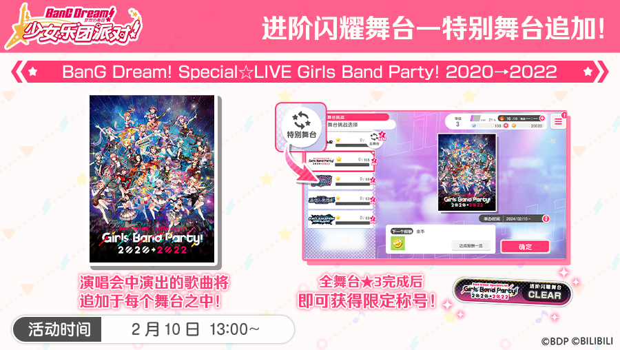 各位亲爱的BanG Dreamer: 进阶闪耀舞台现已开启特别舞台BanG Dream! Special☆LIVE Girls Band Party! 2020→2022!完成全舞台★3演出,即可获得BanG Dream! Special☆LIVE Girls Band Party! 2020→2022开展纪念称号,大家一起来尝试挑战吧~※特别舞台BanG Dream! Special☆