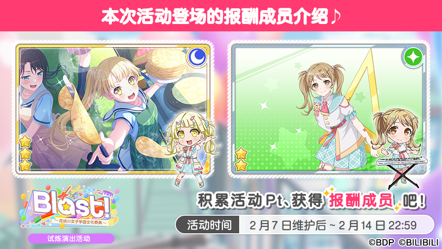 积累活动Pt即可获得附赠衣装的全新活动报酬成员——★3 弦卷心[来一份青春!]、★2 市谷有咲[学校☆EXPO]!本期活动将于2月14日22:59结束,快来参与活动吧~ 今后也请多多支持《BanG Dream! 少女乐团派对!》!