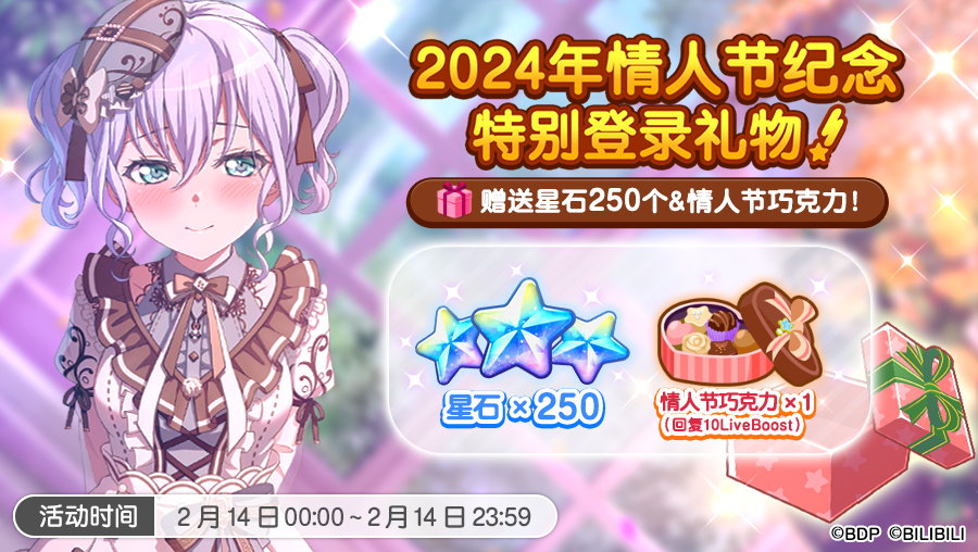 今天(2月14日)是情人节哦!我们为大家准备了2024年情人节纪念 特别登录礼物!请记得在今日内登录游戏领取,领取属于你的巧克力哦~(✪ω✪)★活动时间★2月14日0:00~23:59 ★特别礼物★星石×250情人节巧克力(可回复10点Live Boost)×1 今后也请多多支持《BanG Dream! 少女乐团派对!》!