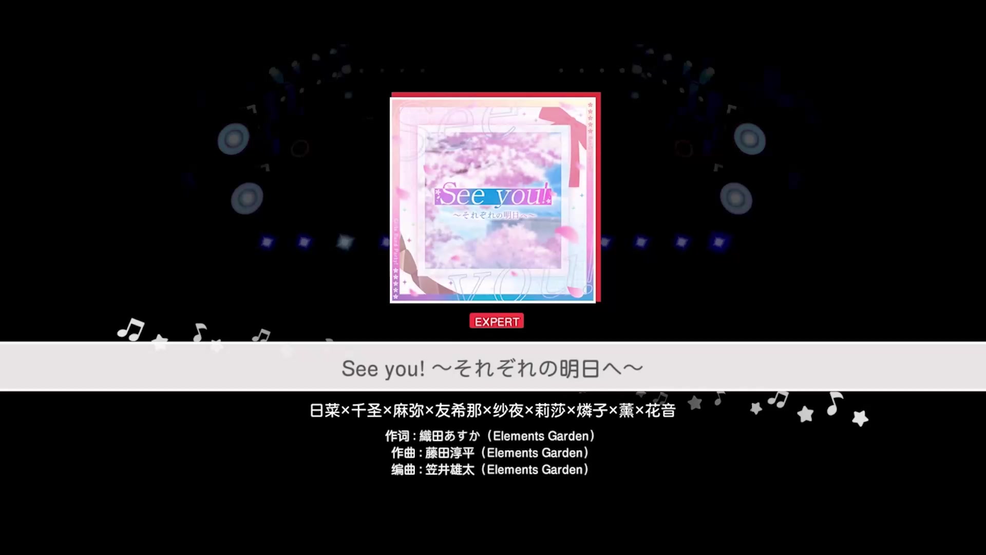 本期曲目是由日菜×千圣×麻弥×友希那×纱夜×莉莎×燐子×薰×花音共同演唱的《See you! 〜それぞれの明日へ〜》,难度为EXPERT,节奏符速度:9.5。 ★歌曲详情★曲名:See you! 〜それぞれの明日へ〜演唱:日菜×千圣×麻弥×友希那×纱夜×莉莎×燐子×薰×花音作词:織田あすか(Elements Garden)作曲:藤田淳平(Elements Garden)编曲:笠井雄太