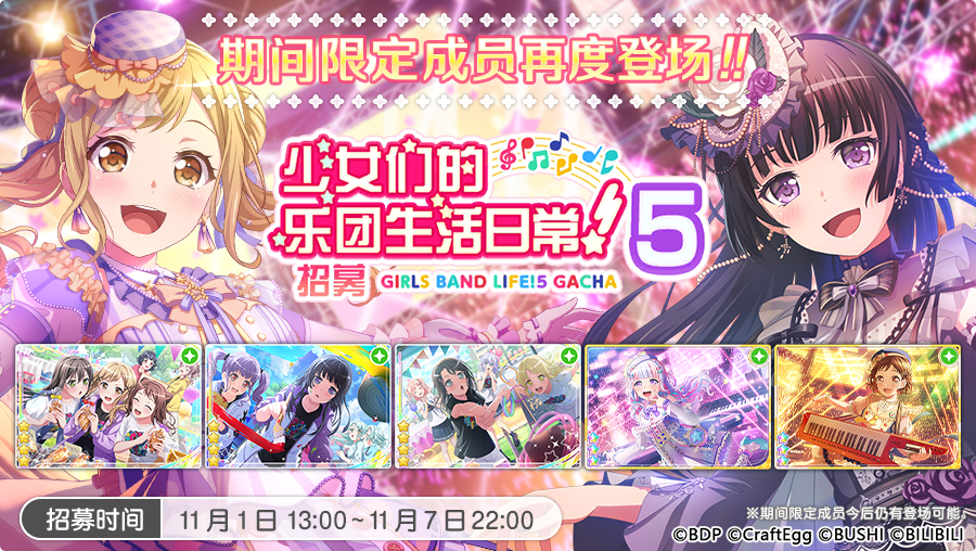 各位亲爱的BanG Dreamer: 11月1日,游戏内将再次开启期间限定招募「少女们的乐团生活日常!5招募」,期间限定成员再度登场!再度登场的期间限定成员相比同稀有度其他成员出现概率提升!★招募日程★招募时间:11月1日13:00~11月7日22:00※由于4.5周年超大型更新维护时间较长,因此本次活动招募时间有所调整,还请留意。 ★招募简介★再度登场期间限定成员:★4