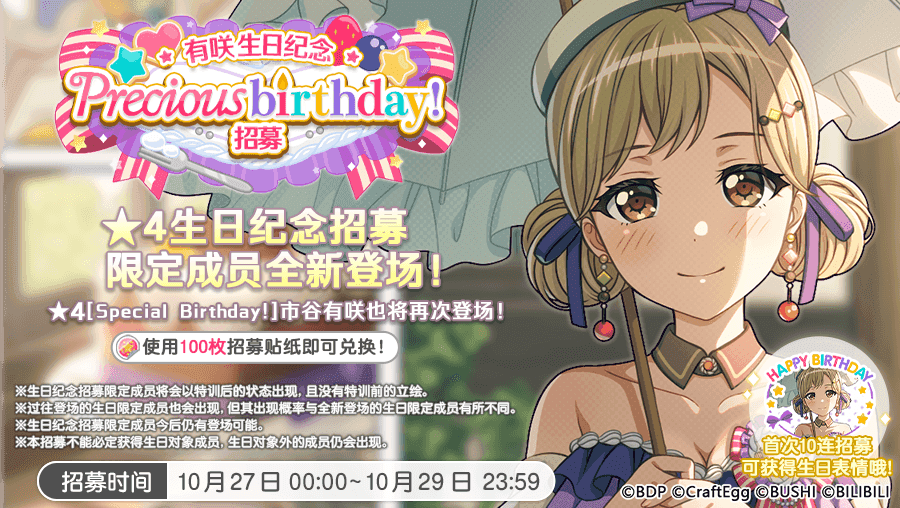 明天(10月27日)就是有咲生日了~明日起,游戏内将限时开放「有咲生日纪念Precious birthday!招募」!首次参与10连招募即可获得生日纪念限定表情,还请不要错过哦!此外,「★4市谷有咲[Special birthday!]」也将在本次在招募中再次登场。※在本招募中出现的包括「★4市谷有咲[Precious birthday!]」在内的所有市谷有咲成员都将会比同稀有度下的的其他成